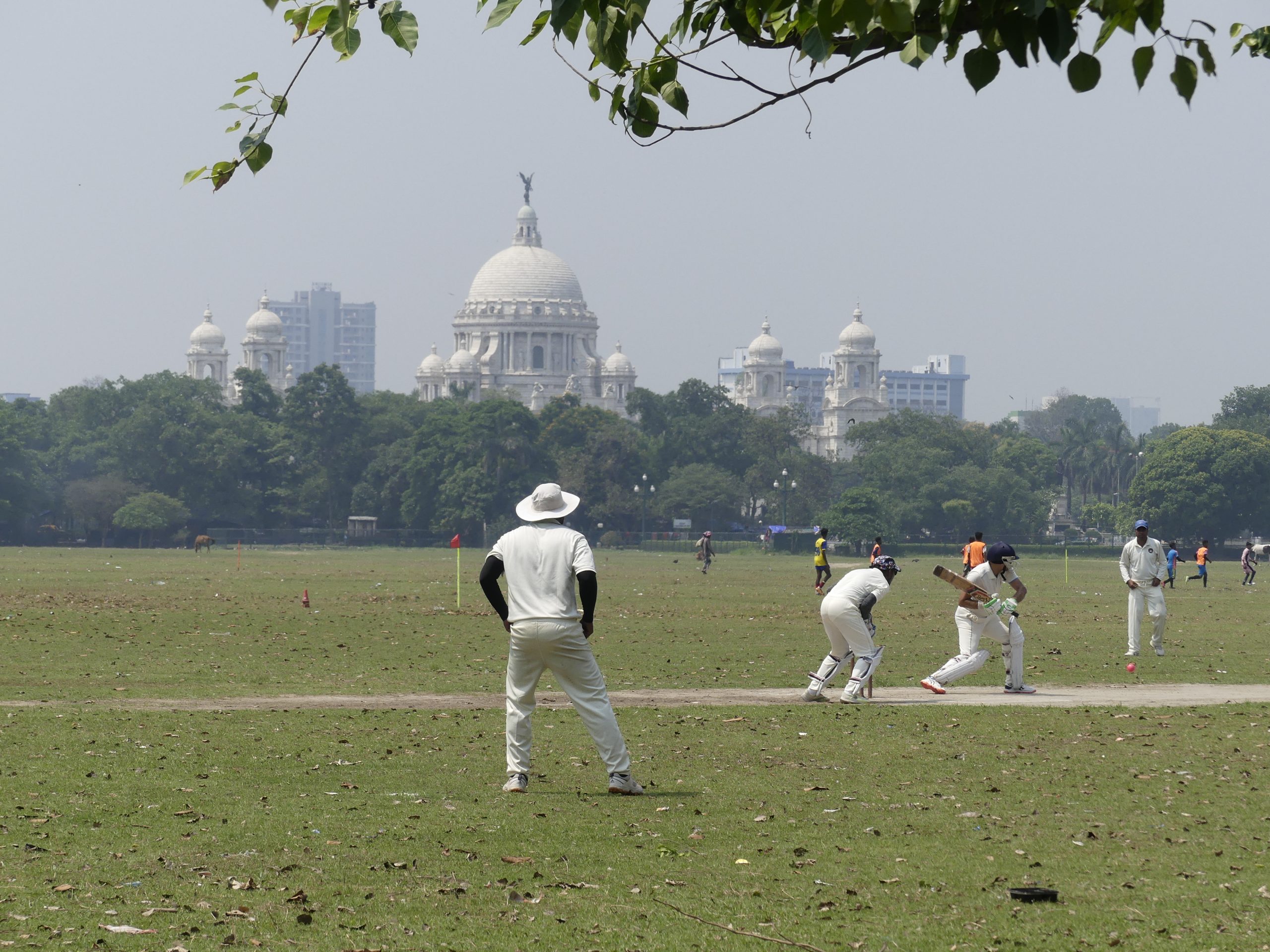 This huge maidan (open field) survives in the middle of Kolkata, a city with a population at this time (2006) of about 13 million. I am full of admiration that, despite the pressure on land, this vast open space remains. A soccer game was going on nearby; in the shade of trees, lovers were spending time together in relative privacy; an occasional horse could be seen grazing; and of course the highlight, a cricket match, was in progress. In the background is the Victoria Memorial built by the British Raj after Queen Victoria died in 1901. Kolkata was the capital of India until 1911; after which it was moved to Delhi.