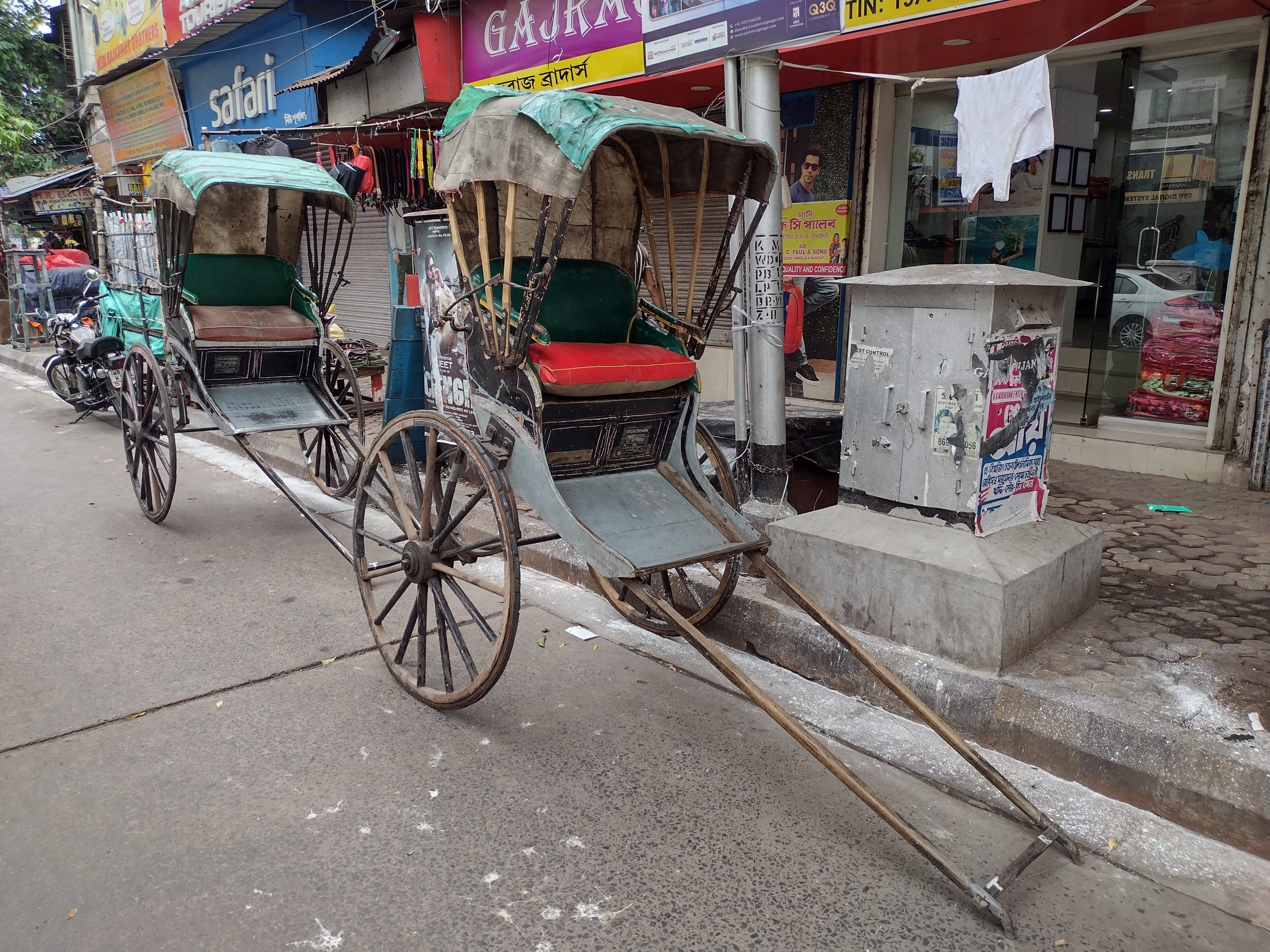 Man-pulled rickshaws continue to transport customers for short distances through the city. They navigate narrow streets well and are an effective means of transportation through the flooded streets during the monsoon season. They were introduced in Kolkata at the turn of the nineteenth century. There is an ambivalence about using them; a reluctance to be pulled by a fellow human being, but also the desire to support their livelihood. Kolkata spreads along the banks of the Hooghly River. Its average elevation is 17 feet (5 meters), so the terrain is flat, an advantage for the men pulling the rickshaws.