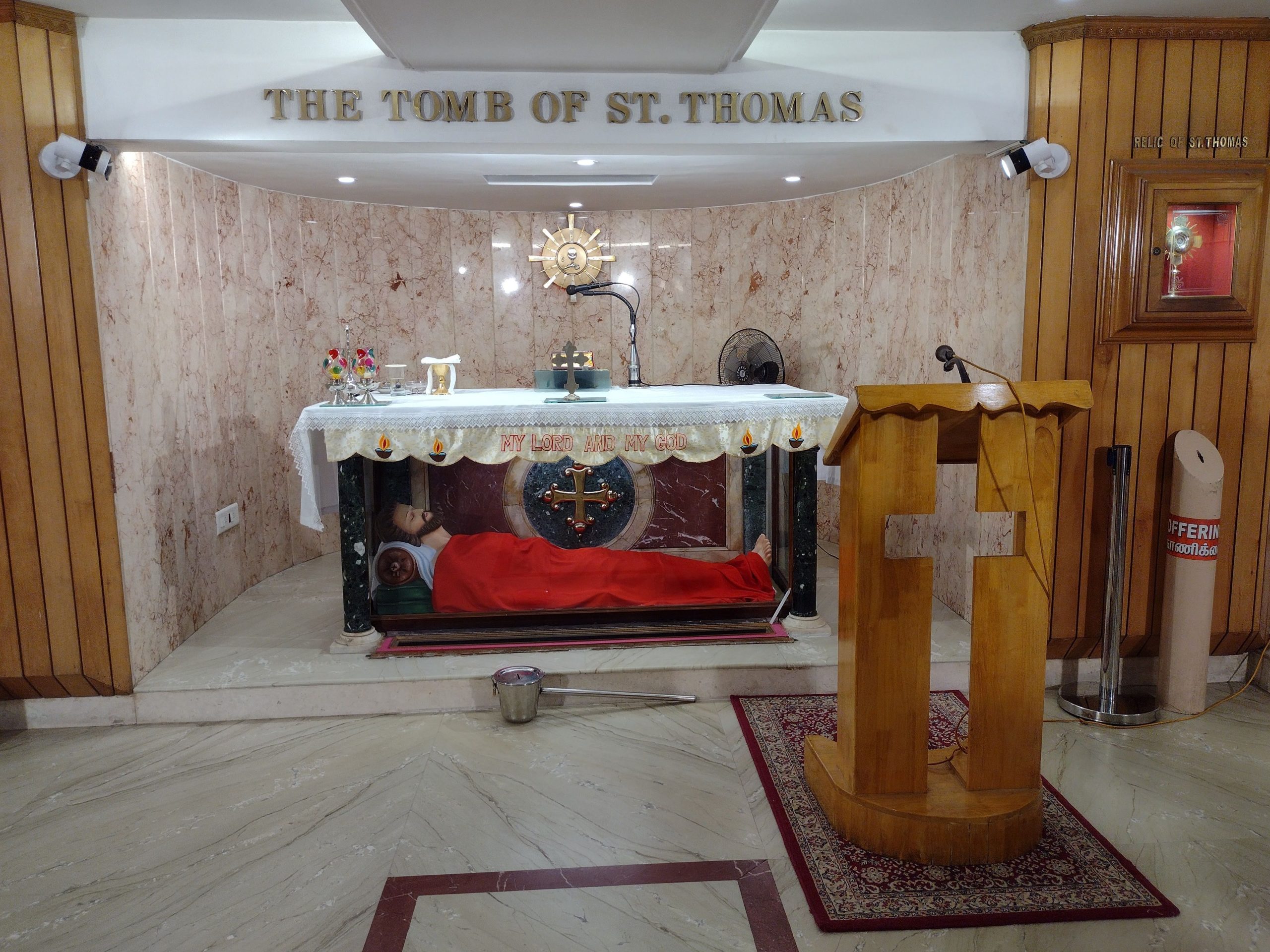 Not far from The Temple of Silence, is St. Thomas Cathedral Basilica / San Thome Church, yet another of Chennai’s treasures. It is located in the San Thome neighborhood and built over the tomb of St. Thomas (the apostle) who is considered to have brought Christianity to India. There is some uncertainty about the exact details of his history in India. After all, it happened more than 2,000 years ago. Traditional accounts of the Saint Thomas Christians of India state that “Apostle Thomas landed in Muziris (Cranganore) in present-day Kerala in 52 CE, and was martyred in Mylapore, near Madras [Chennai] in 72 CE.” (Thomas the Apostle – Wikipedia)