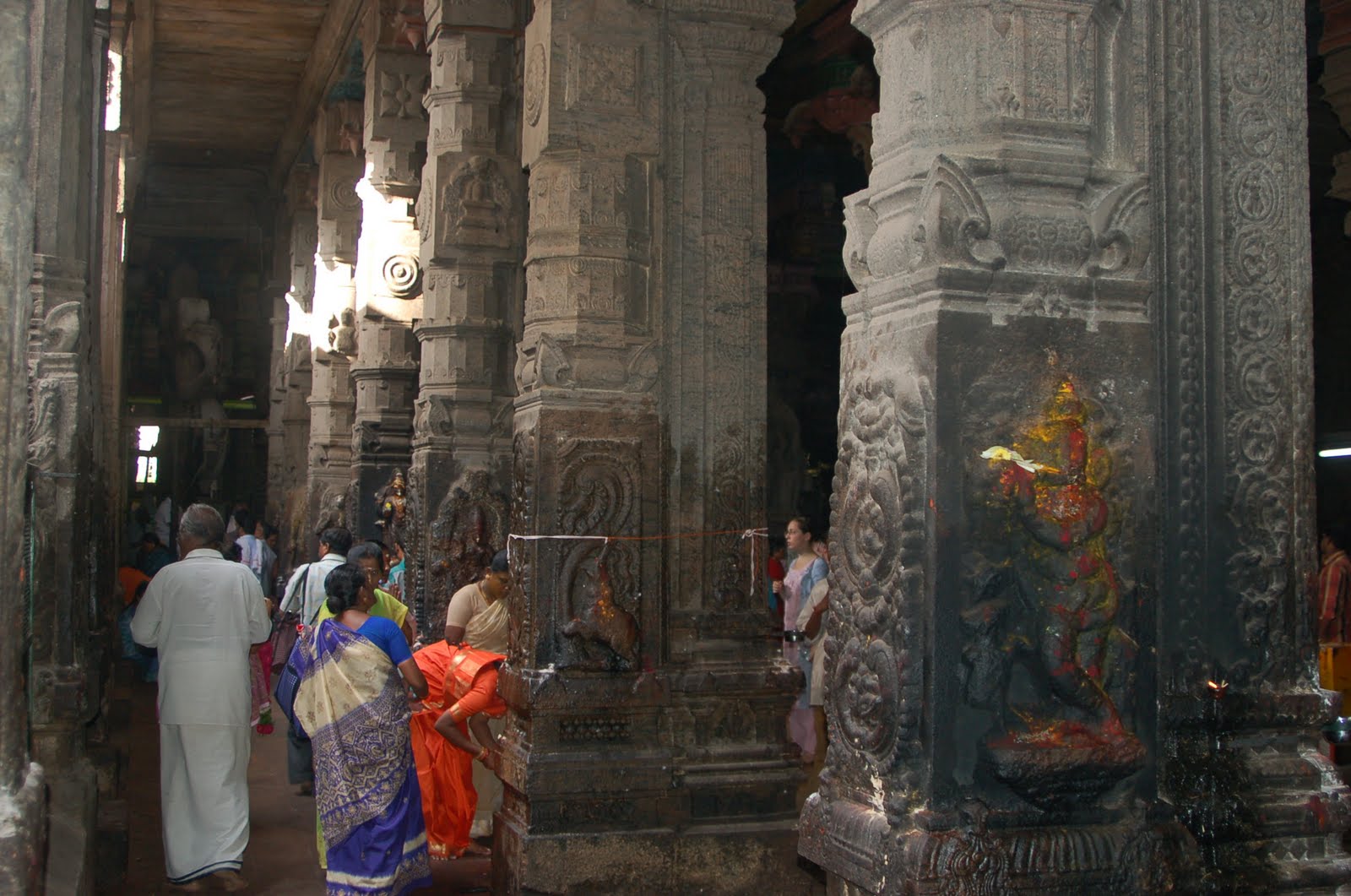 L: There are many alcoves with statues and in this case a shiva lingam. Ramana Maharshi visited the shrines of this temple daily after his experience of death and deathlessness. R: The colors of the saris, the women sitting together with their uniform braids, the men standing apart, and then the light showering on them from the sun god… who could resist trying to capture this moment on camera.